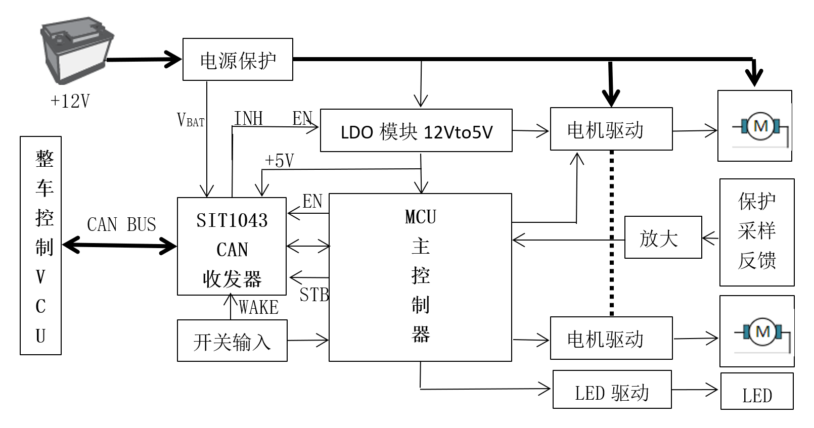 ECU最常見的有:EMS(Engine Mangement System)發(fā)動機管理系統(tǒng),TCU(Transmision Control Unit)自動變速箱控制單元,BCM(Body Control Module)車身控制模塊,ESP(Electronic Stability Program)車身電子穩(wěn)定控制系統(tǒng),BMS(Battery Management System)電池管理系統(tǒng),VCU(Vehicle Control Unit)整車控制器等。隨著ECU控制范圍已經(jīng)擴張到巡航控制、燈光控制 、安全氣囊控制 ,懸架控制 、燃油加熱控制、排氣控制、制動控制、EGR和增壓壓力控制等等。下面我們來介紹SIT1043Q在車門控制模塊中的應(yīng)用。在汽車車門模塊設(shè)計中,其技術(shù)需求: