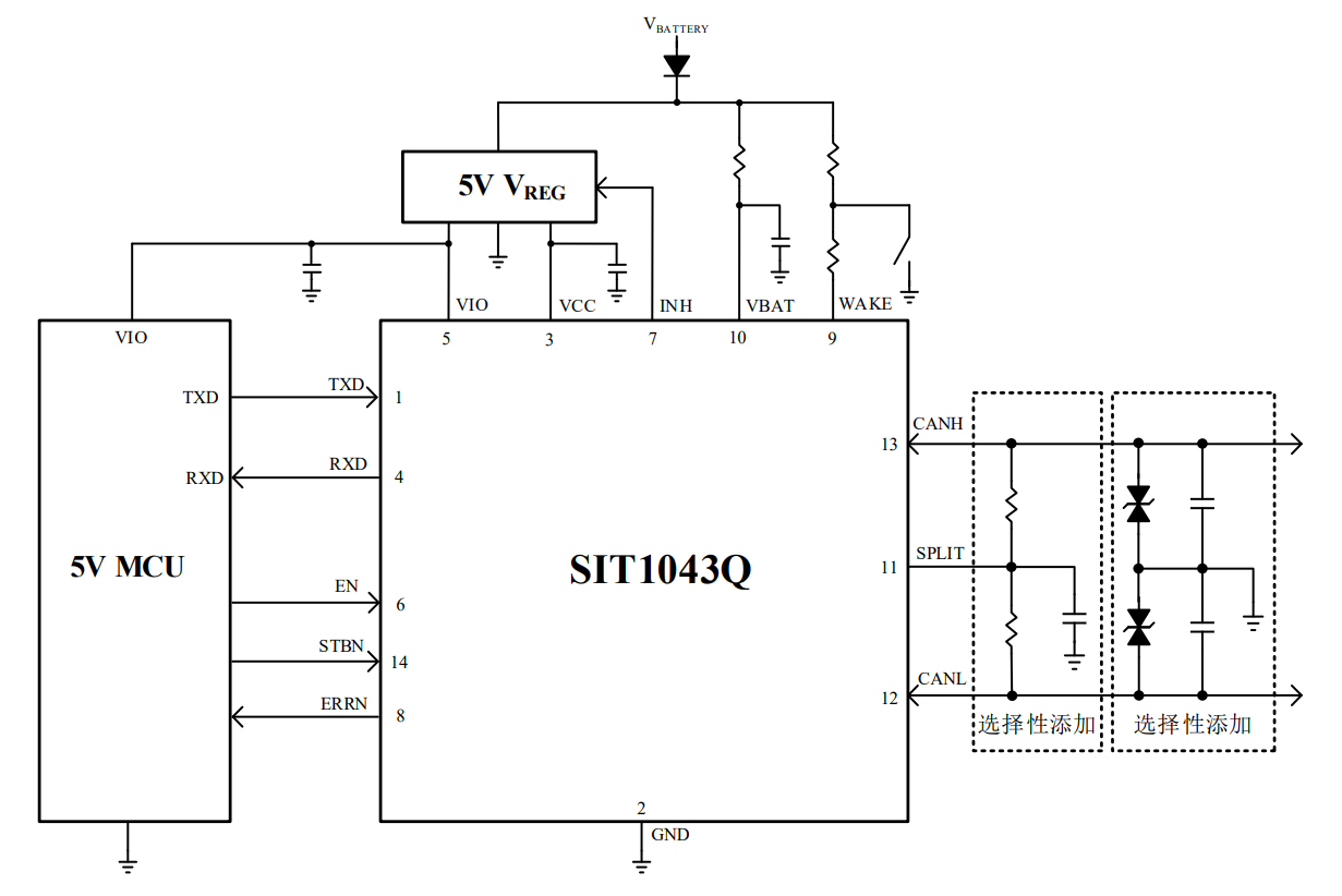 圖6:SIT1043Q典型5V與3.3V系統(tǒng)控制應(yīng)用圖