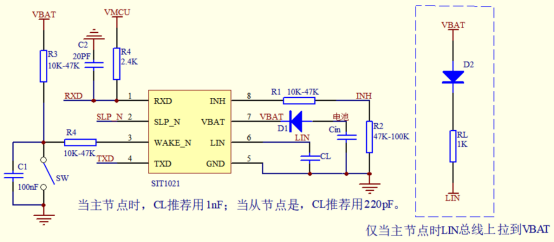 SIT1021在待機(jī)模式、正常模式和上電模式下,INH腳輸出都是高電平(電壓幅值與VBAT相同),只有在休眠模式下輸出才是浮空狀態(tài);如果需要INH腳控制外部電源管理模塊,則需將此腳通過電阻下拉到地看,如下圖,考慮到功耗,下拉電阻R2推薦使用100K(如果電源管理模塊使能腳內(nèi)部未接下拉電阻,則需要外接下拉電阻,如果內(nèi)部有接下拉電阻,則可根據(jù)實際應(yīng)用來決定是否外部加下拉電阻);可根據(jù)電源管理模塊使能腳耐壓,調(diào)節(jié)R1和R2的阻值,以調(diào)節(jié)輸出到電源管理模塊的使能腳電壓。如果不用此功能可以通過電阻上拉到VBAT,或者懸空。應(yīng)用時應(yīng)注意,芯片上電后,需將SLP_N腳置高使芯片進(jìn)入正常模式后,才能將其設(shè)置在休眠模式,如上電后直接將SLP_N腳置低,則無法進(jìn)入休眠模式;另外休眠模式與正常模式可以通過設(shè)置SLP_N腳來回轉(zhuǎn)換;如果在休眠模式下,通過本地喚醒或者遠(yuǎn)程喚醒后,SIT1021先進(jìn)入待機(jī)模式,同時RXD輸出喚醒標(biāo)志(置低),TXD輸出喚醒源標(biāo)志(置低(弱下拉代表遠(yuǎn)程喚醒,強(qiáng)下拉代表本地喚醒));當(dāng)MCU檢測到喚醒標(biāo)志后,通過喚醒源標(biāo)志檢測到喚醒源,控制SLP_N置高,進(jìn)入正常模式,接收數(shù)據(jù)。