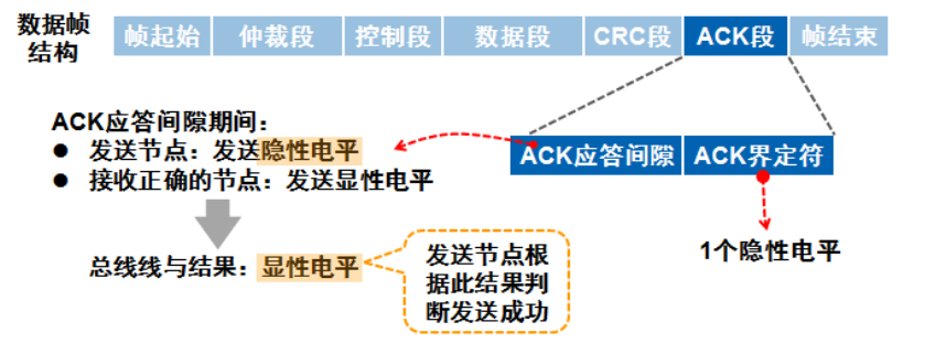 ACK段長度為2個(gè)位,包含應(yīng)答間隙(ACK SLOT)和應(yīng)答界定符(ACK DELIMITER)。在應(yīng)答場里,發(fā)送站發(fā)送兩個(gè)“隱性”位。當(dāng)接收器正確地接收到有效的報(bào)文,接收器就會(huì)在應(yīng)答間隙(ACK SLOT)期間(發(fā)送ACK信號(hào))向發(fā)送器發(fā)送一“顯性”的位以示應(yīng)答。發(fā)送節(jié)點(diǎn)檢測(cè)到總線呈顯性狀態(tài)時(shí),就認(rèn)為有節(jié)點(diǎn)進(jìn)行了有效地應(yīng)答并且自己所發(fā)出的幀是正常的。