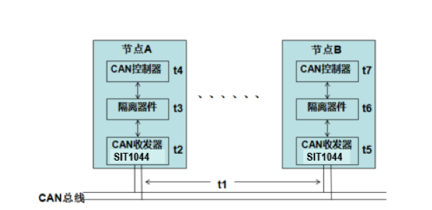 以節(jié)點(diǎn)A發(fā)送,節(jié)點(diǎn)B接收為例,從CAN報(bào)文發(fā)出開始,到接收到ACK應(yīng)答,整個(gè)應(yīng)答回路延時(shí)為T總=(t1+t2+t3+t4+t5+t6+t7)*2,期間報(bào)文經(jīng)過了4次隔離及收發(fā)器,兩次線纜;