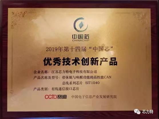 2019年10月25日,“中國芯”第十四屆集成電路產(chǎn)業(yè)促進大會在青島舉行。在會上公布了“中國芯”優(yōu)秀產(chǎn)品征集的結(jié)果。芯力特有線通信接口芯片:帶休眠與喚醒功能的高性能CAN總線芯片SIT1040,榮獲“優(yōu)秀技術(shù)創(chuàng)新產(chǎn)品”,是本次“中國芯”大獎評比在有線通信接口領(lǐng)域僅有的1顆獲獎芯片!