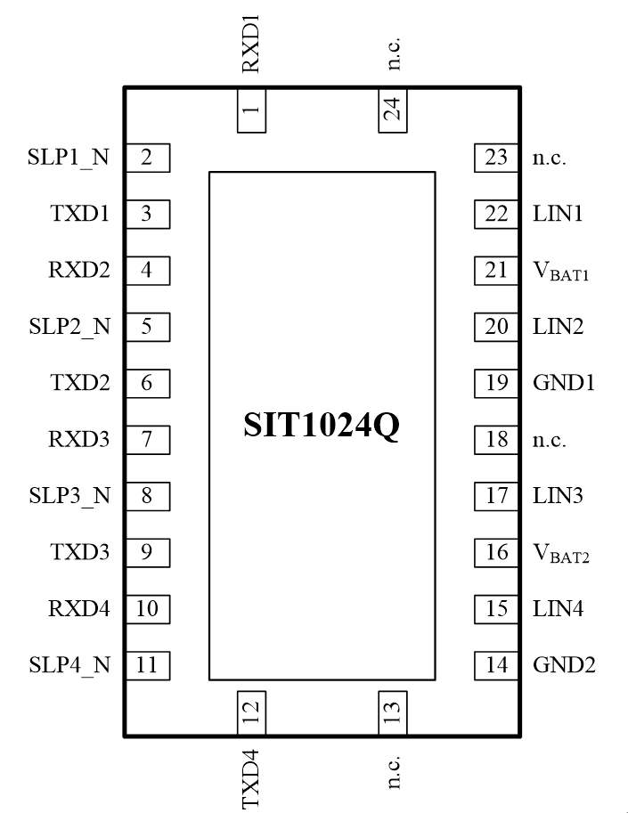 SIT1024Q是一款四通道本地互聯(lián)網(wǎng)絡(LIN)物理層收發(fā)器,符合LIN 2.0、LIN 2.1、LIN 2.2、LIN 2.2A、ISO 17987-4:2016 (12V) 和SAE J2602標準。主要適用于使用1kbps至20kbps傳輸速率的車載網(wǎng)絡。SIT1024Q通過TXDx引腳控制 LINx總線的狀態(tài),可將協(xié)議控制器的發(fā)送數(shù)據(jù)流轉(zhuǎn)換為具有最佳壓擺率和波形整形的總線信號,以最大程度地減少電磁輻射發(fā)射(EME)。LIN總線輸出引腳具有內(nèi)部上拉電阻,僅當用作主機節(jié)點時,才需將LIN總線端口通過一個與二極管串聯(lián)的外部電阻上拉至VBATx。SIT1024Q通過LINx引腳接收總線上的數(shù)據(jù)流,并由接收器的輸出引腳RXDx將數(shù)據(jù)傳送到外部的微控制器。