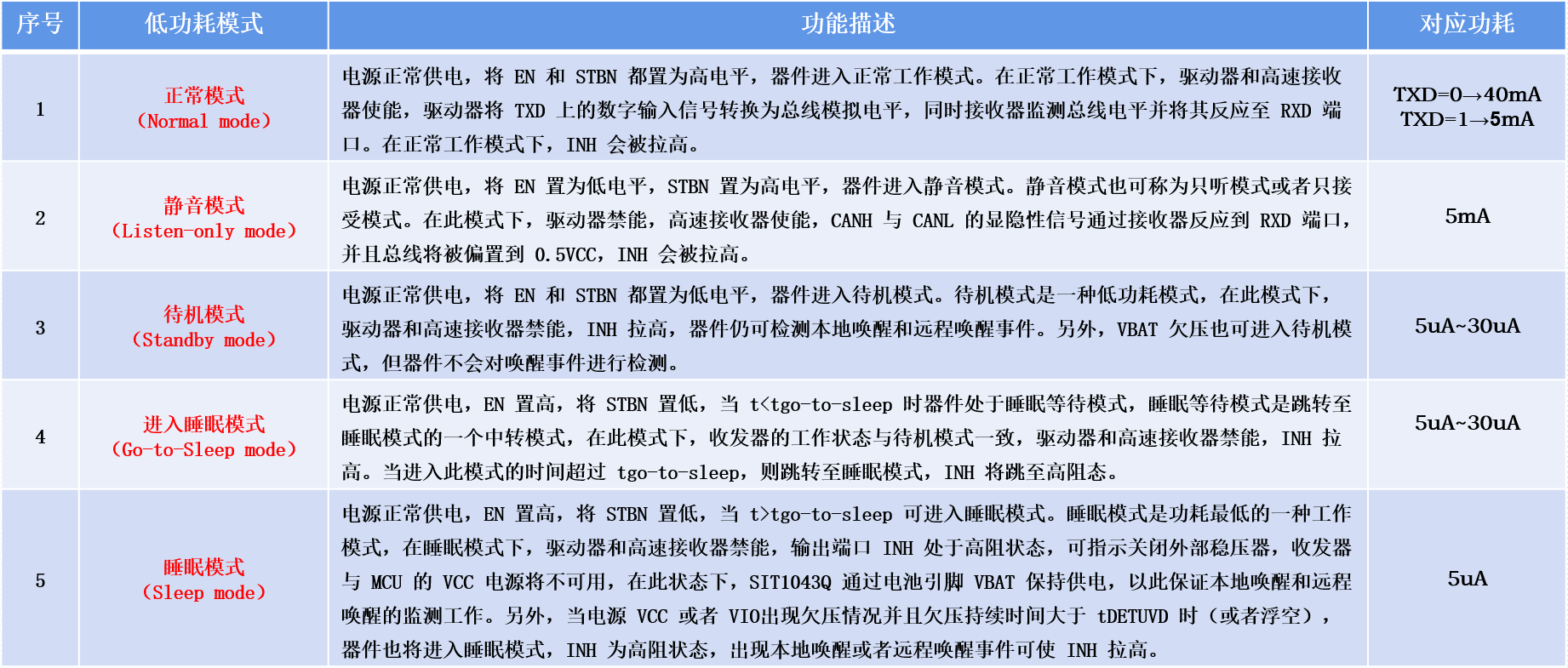 遠程喚醒:喚醒源來源于自身ECU節(jié)點所在的網(wǎng)絡(luò)報文,該節(jié)點可以處于完全睡眠狀態(tài),一般無能量消耗。這種喚醒的特點:只有當CAN收發(fā)器監(jiān)控到總線電平變化或者特定報文時,就會接通CAN芯片INH引腳控制LDO給到主控芯片上電,從而喚醒ECU節(jié)點。芯力特公司的SIT1043Q CAN收發(fā)器兼容以上兩種喚醒功能,下面我們來對SIT1043Q做個簡單的介紹。
